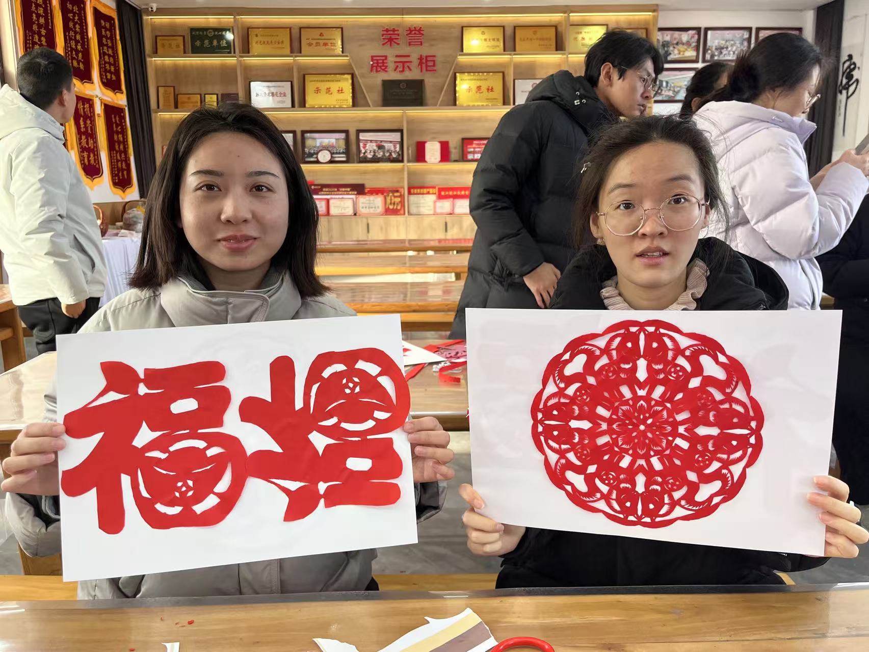 沉浸式参观结束后,一场生动有趣的剪纸体验课温情开讲。山西省非物质文化遗产黎城剪纸代表性传承人杨斐老师亲临现场,为志愿者们系统讲解了黎城剪纸的历史渊源、民俗寓意,手把手演示了折叠、勾勒、剪裁等基础技法。志愿者们兴致盎然,纷纷拿起剪刀和红纸,在杨老师的悉心指导下凝神专注创作。红纸在指尖翻飞流转,剪刀在纸上精准游走,转眼间,一张张寓意吉祥的剪纸作品便跃然纸上,现场充满了创作的喜悦与成就感。