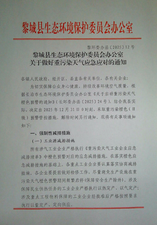 发文机关长治市生态环境局黎城分局 主题词重污染天气应急应对