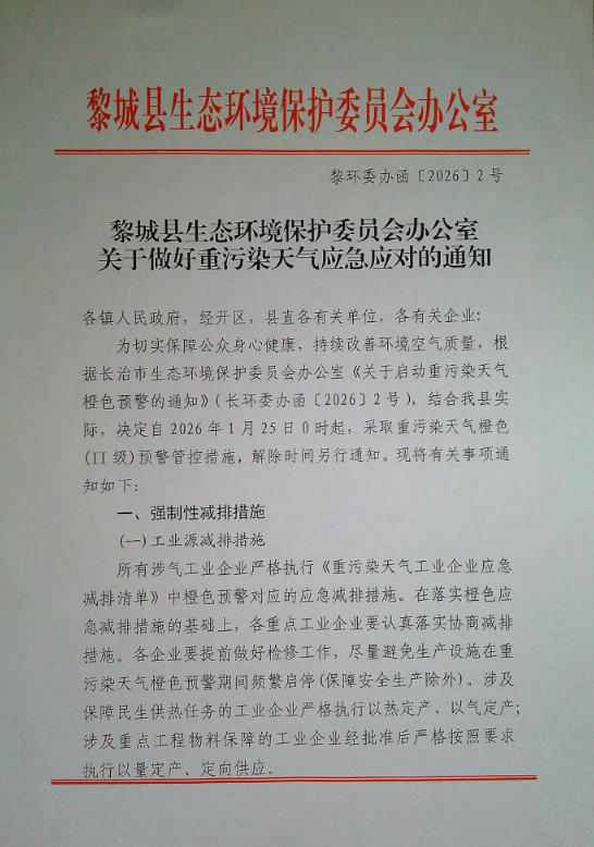 发文机关长治市生态环境局黎城分局 主题词重污染天气