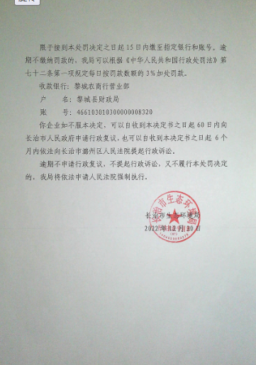 黎城县长福煤气焦化有限公司行政处罚决定书
