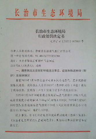 黎城县长福煤气焦化有限公司行政处罚决定书