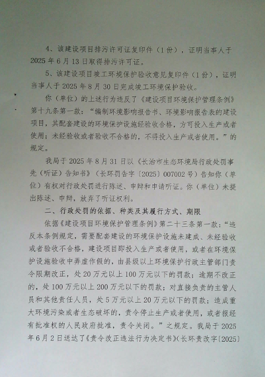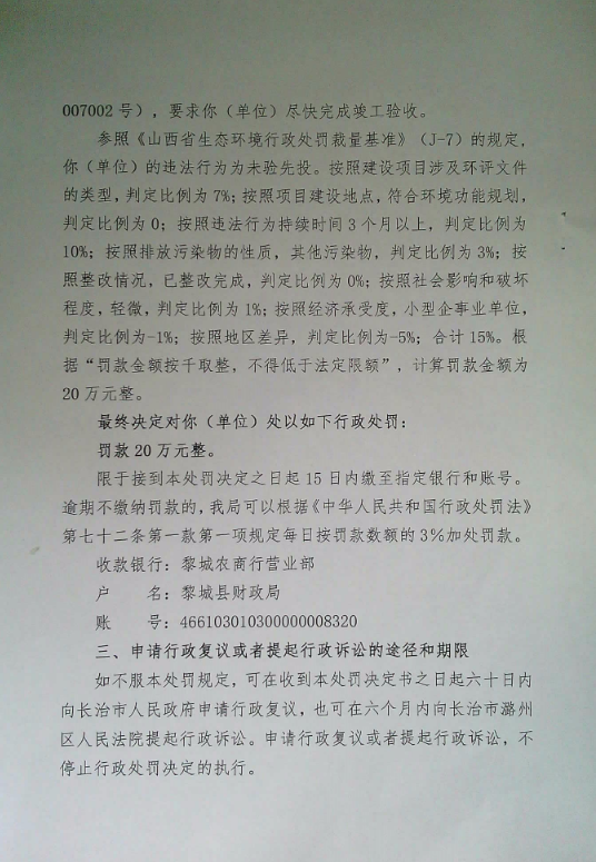 发文机关长治市生态环境局黎城分局 主题词处罚决定书