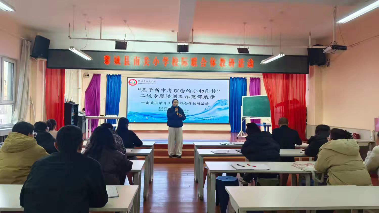 冬意渐浓,寒意袭人,却挡不住教育人深耕细研的热忱。为落实国家新课程方案与新课程标准精神,准确把握义教阶段贯通教育学科育人目标与内容要求,做好小初衔接,切实提升教学质量。我校于2025年11月19日上午在南关小学开展以“基于新中考理念的小初衔接二级培训及示范课展示”的联片教研活动,我们邀请了长治市教学能手平顺县阳高乡中心小学刘学林老师和黎城三中江丽丽老师进行示范课展示,实现校际协同,资源共享,促进教师专业成长。