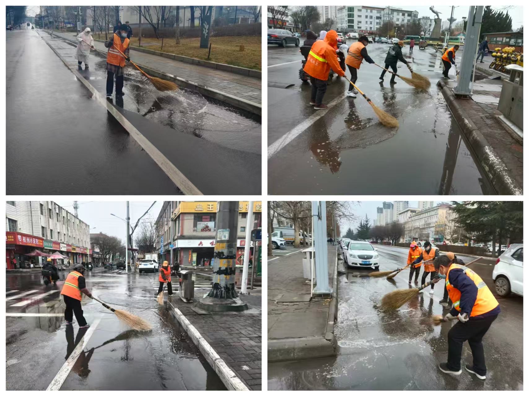 为保障辖区主次干道排水井口畅通,在雨势减弱后,环卫工人第一时间利用扫帚、自制推水挡板等工具,对辖区内主次干道、人行道、公交站点及雨水井周边路面展开推水作业。其中,重点加大广北路、河下西街十字路口、东河大桥、城东路等易积水路段的清理力度,针对积水严重的路段,组织人员实施集中攻坚,全力保障道路交通有序通行。