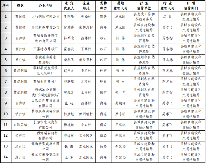 为加强对全县货物运输源头单位的监督管理,根据省、市2026年治超工作要求,全面落实省委、省政府和交通运输部决策部署,坚持人民至上、生命至上,坚持系统治理、源头治理、科技治理、依法治理,持续推进治超模式向制度化、规范化、数字化治理转变,坚决遏制严重违法超限超载行为,切实维护道路交通运输安全和公路基础设施安全。经县政府同意,现将全县14家重点合法货运源头企业名单向全社会公示。各镇和相关单位要各司其职,密切配合,切实履行好源头治超监管责任,监督源头企业落实安全生产主体责任,同时要加大对非法源头企业的打击力度,依法查处,并配套细化“一超四罚”和省政府第301号令实施细则,增强制度的可操作性和执行力,动员社会各界和广大群众对非法超限超载车辆和非法装载企业进行监督举报,监督举报电话0355-6589813,确保超载车辆不上路,上路车辆不超载,保障人民群众生命和财产安全。